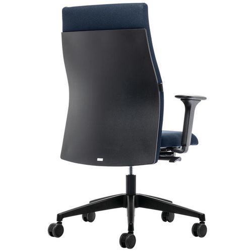 Siège de bureau pivotant avec dossier haut rembourré. Système sur mécanisme synchrone avec réglage automatique de tension. Soutien lombaire réglable en hauteur. Accoudoirs en T 4D pour soulager la musculature du cou et de la nuque. Blocable en position avant et arrière pour plus de flexibilité.