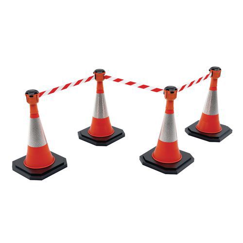 Chaque unité est équipée de 9 mètres de ruban en tissu de haute qualité rétractable rouge/blanc ou jaune/noir.