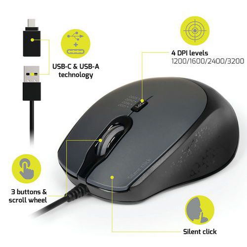 | Intitulé du produit | Souris filaire PRO OFFICE SILENT -BLACK, Type de capteur: Optique, Type de molette: Molette de défilement |