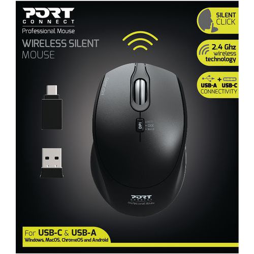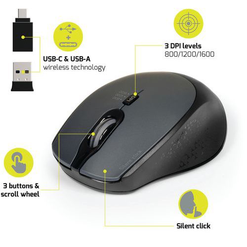 | Intitulé du produit | Souris sans fil Pro silencieuse noire, Type de capteur: Optique, Type de molette: Molette de défilement |