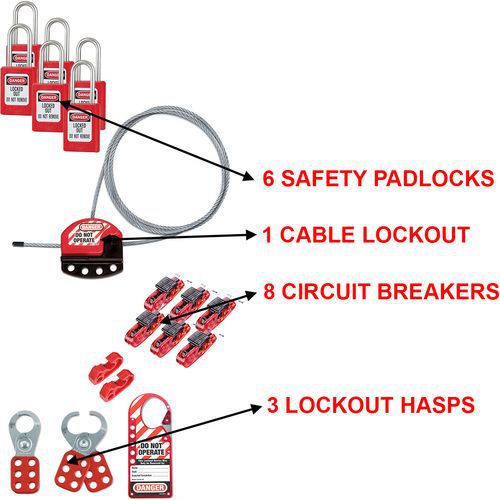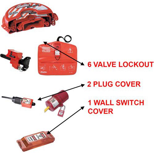 Éléments inclus : station S1900, 6 cadenas 410RED, 2 crochets 420, 1 crochet 427, 1 câble S806, 4 bloque vannes à volant 480, 481, 482 et 483, 1 bloque vanne à sphère 468L, 1 bloque vanne 1/4 tour , 1 bloque prise électrique S2005, 1 blqoue prise de 240 à 550 volts 488, 2 bloques-disjoncteur 491B, 6 bloques-disjoncteur 493B, 2 dispositifs de consignation pour interrupteur mural 496B, 2 sachets d'étiquettes 497A.