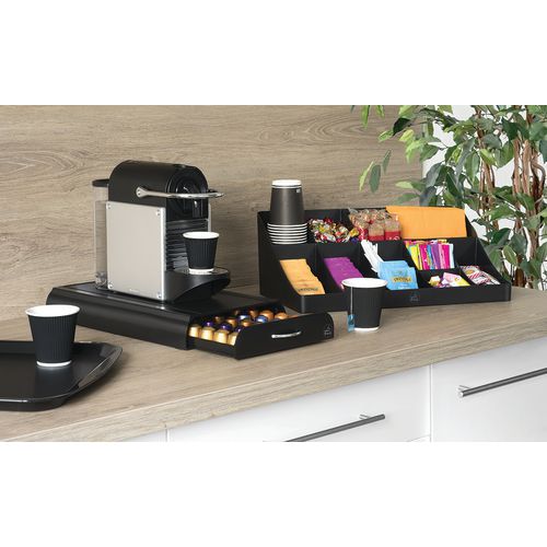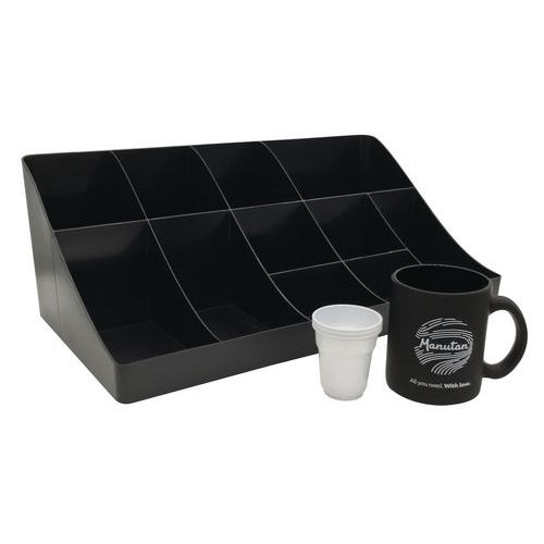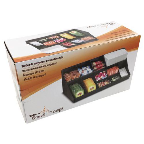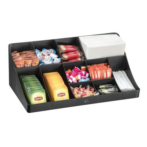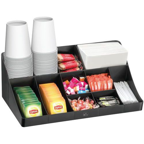 11 compatiments pour ranger tous les accessoires nécessaires à côté de la cafetière, de la bouilloire (serviettes, gobelets, cuillères, sucres, sachets de thé...).
