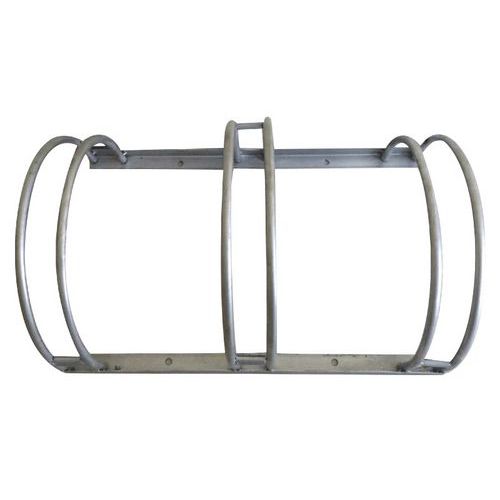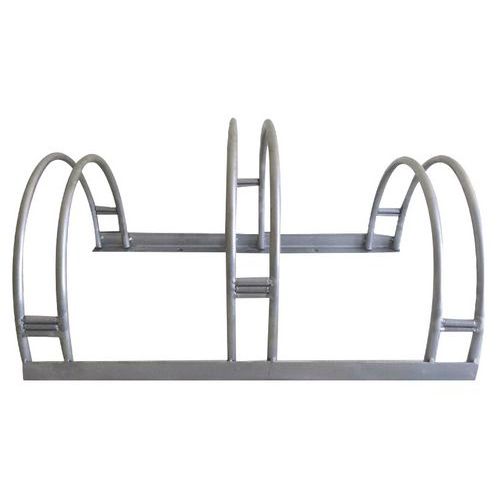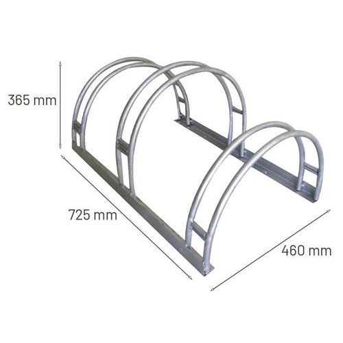 Support compatible avec vélos classiques ou VTT. Espace important entre les vélos pas de risque de rayures. Bonne résistance aux intempéries. Fixation au sol nécessaire. Largeur maximale de roue : 53mm. Espacement entre les roues : 200mm. Garantie client : 10 ans Finition : Galvanisée