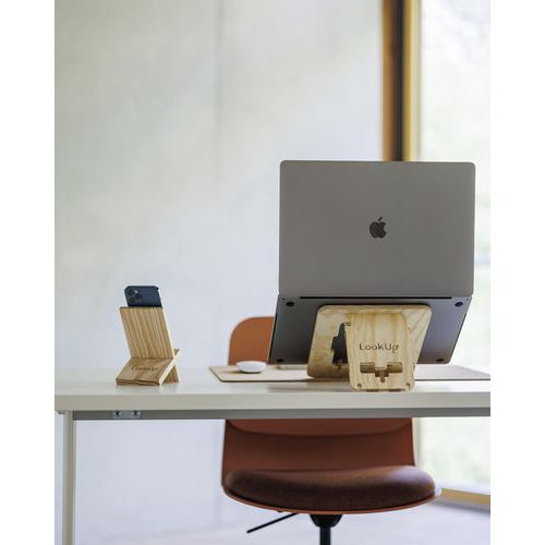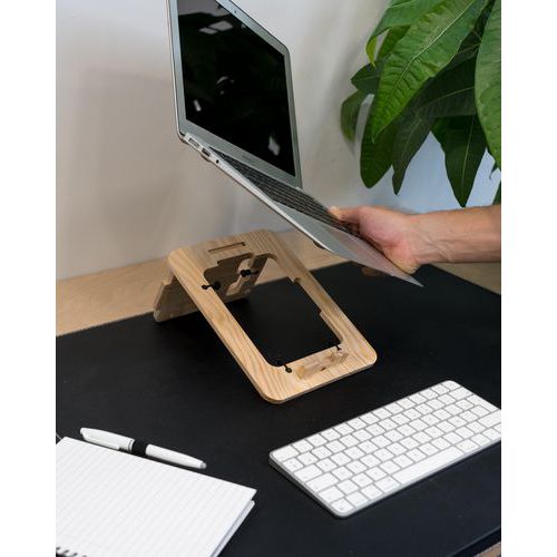 Support ordinateur bois ADASO13 LookUp, améliore naturellement votre posture et votre environnement de travail. Vous aide à réduire vos tensions musculaires au bureau et à la maison. Un design encastrable et léger, facilement transportable. Compatible pour vos PC et MacBook. Utilisable avec et sans clavier déporté. S’adapte instantanément à votre utilisation grâce à sa double inclinaison possible. Fabriqué en bois de pin revalorisé.