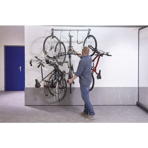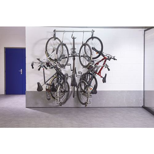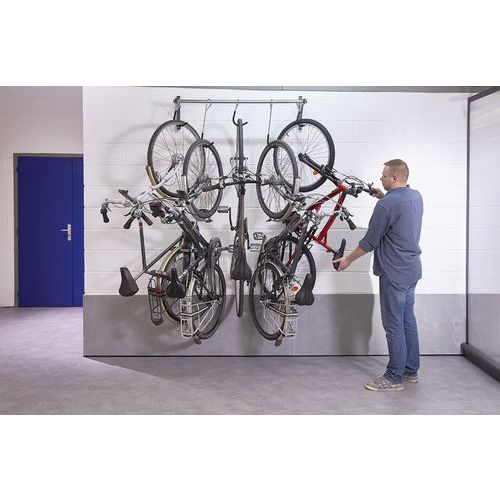 Support vélo mural coulissant à crochets capacité 5 vélos.