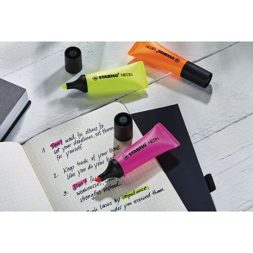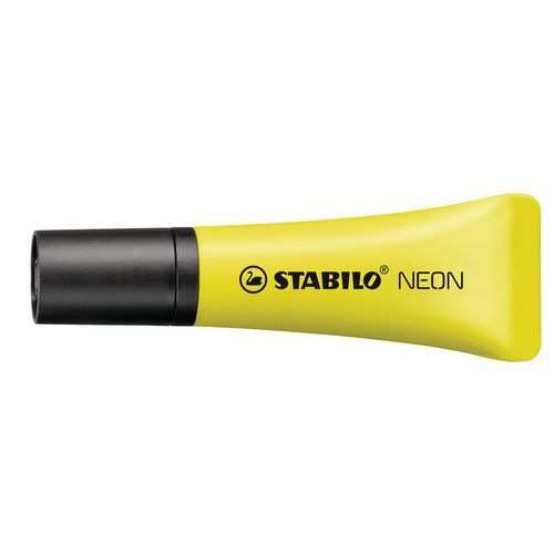 STABILO NEON est un surligneur haute performance en forme de tube qui ne laisse pas indifférent. Grâce à un procédé anti-dessèchement, il peut rester ouvert jusqu'à 4 heures sans sécher. Pointe biseautée, largeur de tracé : 2 - 5mm. Encre à base d’eau. Une encre fluorescente intense et résistante à la lumière.