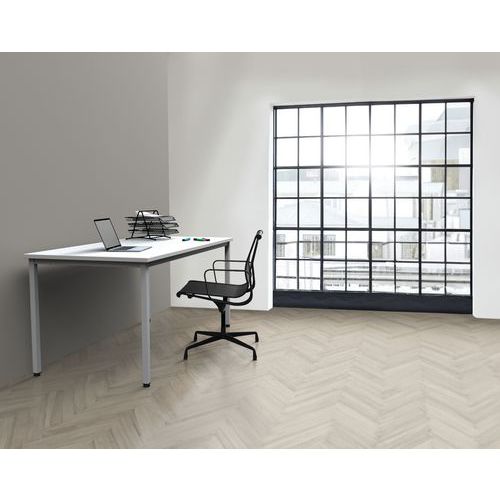 Table 4 pieds avec piètements sur vérins réglables en synthétique. Piètements en tubes carrés de 35x35x2 mm avec renfort en métal dans les coins. Structure métallique solide en tôle de 1.5 mm. Les parties métalliques sont peintes en poudre epoxy-polyester. Hauteur bureau fixe: standard à 75 cm (incl. top de 25 mm).