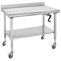 Piètement : tubes en acier inoxydable carré 40 x 40 mm. Système hydraulique (course 0 -300 mm) commandé par une manivelle escamotable. 4 roues en acier inoxydable Ø 125 mm dont 2 à