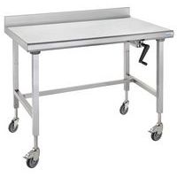 Piètement : tubes en acier inoxydable carré 40 x 40 mm. Système hydraulique (course 0 -300 mm) commandé par une manivelle escamotable. 4 roues en acier inoxydable Ø 125 mm dont 2 à