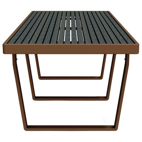 Table Arbane en Ipra, matière produite à partir de plastiques multi composants. Résistance au gel, à la mousse, aux UV, lisse sans risque d'écharde, traitement anti tags, nettoyage à l'eau. Structure aluminium laqué : métal léger qui a une grande résistance à la corrosion. Sans entretien, sans traitement, imputrescible. Durée de vie accrue par rapport aux modèles en bois et en plastiques. Garantie : 25 ans sur l'Ipra, 10 ans sur l'alu Fabrication à partir de matières recyclées : canettes, pots de fleurs, aluminium… Classement au feu M4. Kit de fixation fourni