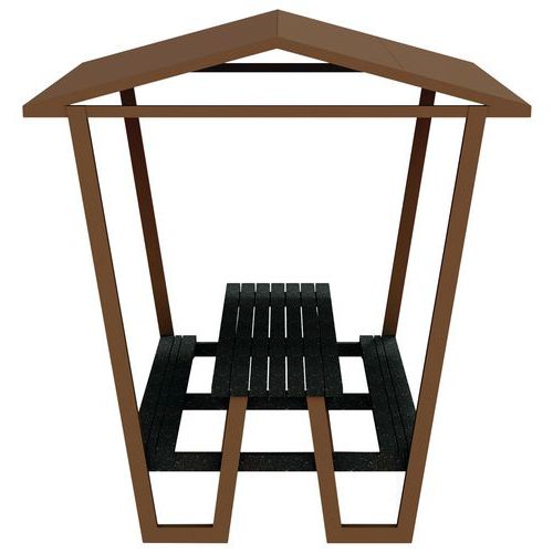 Table bancs Chardonnay toiture pleine, en Ipra, matière produite à partir de plastiques multi composants. Résistance au gel, à la mousse, aux UV, lisse sans risque d'écharde, traitement anti tags, nettoyage à l'eau. Structure aluminium laqué : métal léger qui a une grande résistance à la corrosion. Sans entretien, sans traitement, imputrescible. Durée de vie accrue par rapport aux modèles en bois et en plastiques. Garantie 25 ans sur l'Ipra, 10 ans sur l'alu Fabrication à partir de matières recyclées : canettes, pots de fleurs, aluminium… Classement au feu M4. Kit de fixation fourni