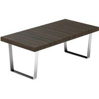 Plateau realisé en aggloméré ép. 18 mm, en placage bois épaisseur 0,6 mm, avec les côtés longitudinaux travaillés à folding pour avoir des bandes de hauteur 50 mm dans un seul pièce, avec chants perimètrales en bois ép. 1 mm, coins rayonnés 0,5 mm et verni transparent mat à pore semi-ouvert. Pied en plat d’acier à section 50x6 mm, plié à panneau, avec soudé dans la partie superiéure des plaques en tôle d’acier décapée épaisseur 3 mm, finition chromé. Les pieds ont des patins anti glissement.