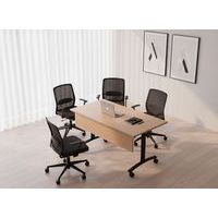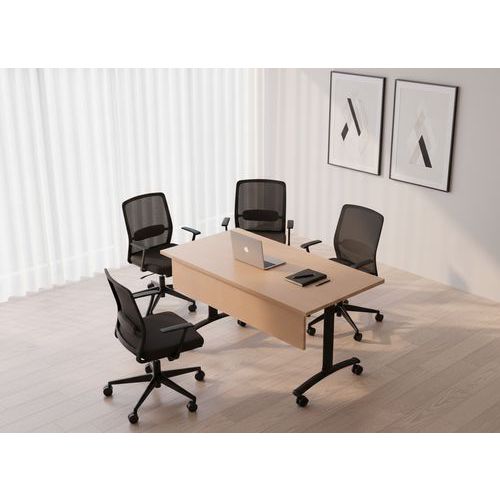 Equipée de 4 roulettes en polyamide Ø 75 mm avec frein.Table de réunion carrée pliante avec voile de fond Axe avec plateau pivotant permettant un gain de place pour le rangement.