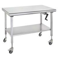 Piètement : tubes en acier inoxydable carré 40 x 40 mm. Système hydraulique (course 0 -300 mm) commandé par une manivelle escamotable. 4 roues en acier inoxydable Ø 125 mm dont 2 à