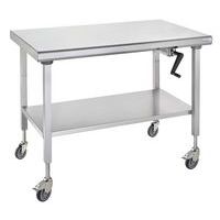 Piètement : tubes en acier inoxydable carré 40 x 40 mm. Système hydraulique (course 0 -300 mm) commandé par une manivelle escamotable. 4 roues en acier inoxydable Ø 125 mm dont 2 à