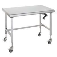 Piètement : tubes en acier inoxydable carré 40 x 40 mm. Système hydraulique (course 0 -300 mm) commandé par une manivelle escamotable. 4 roues en acier inoxydable Ø 125 mm dont 2 à