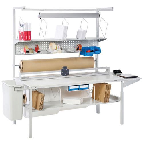 Table d’emballage TPB. Une solution tout-en-un sûre, économique et ergonomique. Un colis à plat contient tout l’équipement de base. Facile à acheter, à transporter et à monter. Matériaux sélectionnés avec soin, finitions de qualité supérieure, composants en acier époxy (RAL 7035). Établi laminé, stratifié basse pression 25 mm. Charge max. 300 kg.