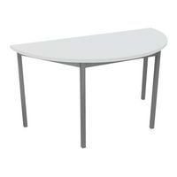 Table de réunion demi-lune polyvalente avec plateau mélaminé, épaisseur 25 mm. Chants ABS anti-choc 2 mm. Cadre métallique porteur de section 50 x 20 mm, rêvetement époxy, finition identique aux pieds. Piétement métal de section 30 x 30 mm finition époxy laqué Vérins de réglages de course 10 mm pour corriger les défauts du sol et proposer un alignement parfait entre les tables.