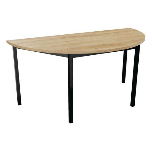 Table de réunion demi-lune polyvalente avec plateau mélaminé, épaisseur 25 mm. Chants ABS anti-choc 2 mm. Cadre métallique porteur de section 50 x 20 mm, rêvetement époxy, finition identique aux pieds. Piétement métal de section 30 x 30 mm finition époxy laqué Vérins de réglages de course 10 mm pour corriger les défauts du sol et proposer un alignement parfait entre les tables.