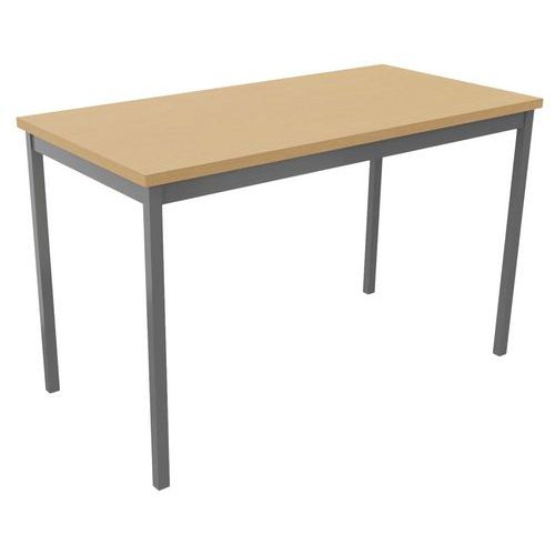 Table de réunion droite polyvalente avec plateau mélaminé, épaisseur 25 mm. Chants ABS anti-choc 2 mm. Cadre métallique porteur de section 50 x 20 mm, rêvetement époxy, finition identique aux pieds. Piétement métal de section 30 x 30 mm finition époxy laqué Vérins de réglages de course 10 mm pour corriger les défauts du sol et proposer un alignement parfait entre les tables.