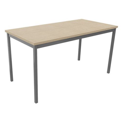 Table de réunion droite polyvalente avec plateau mélaminé, épaisseur 25 mm. Chants ABS anti-choc 2 mm. Cadre métallique porteur de section 50 x 20 mm, rêvetement époxy, finition identique aux pieds. Piétement métal de section 30 x 30 mm finition époxy laqué Vérins de réglages de course 10 mm pour corriger les défauts du sol et proposer un alignement parfait entre les tables.