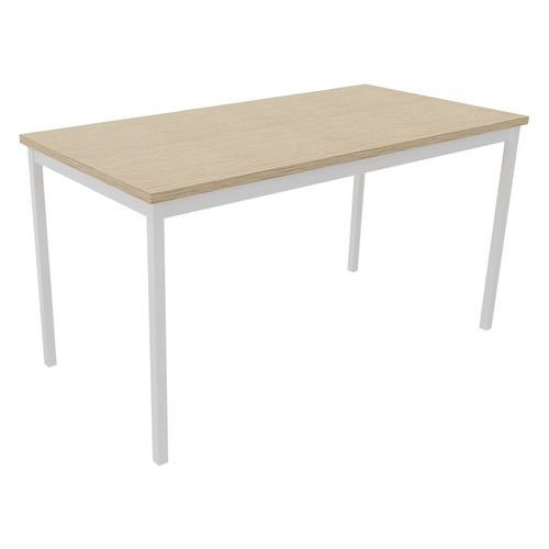 Table de réunion droite polyvalente avec plateau mélaminé, épaisseur 25 mm. Chants ABS anti-choc 2 mm. Cadre métallique porteur de section 50 x 20 mm, rêvetement époxy, finition identique aux pieds. Piétement métal de section 30 x 30 mm finition époxy laqué Vérins de réglages de course 10 mm pour corriger les défauts du sol et proposer un alignement parfait entre les tables.