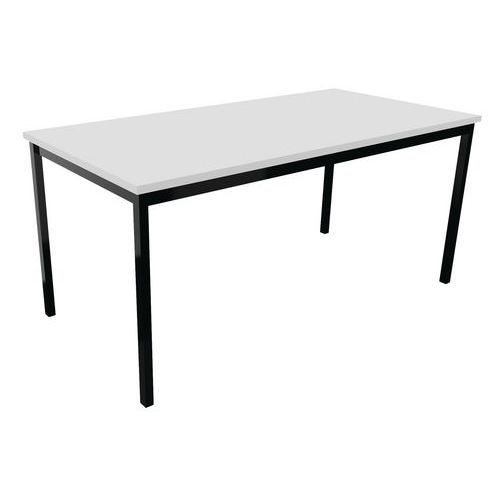 Table de réunion droite polyvalente avec plateau mélaminé, épaisseur 25 mm. Chants ABS anti-choc 2 mm. Cadre métallique porteur de section 50 x 20 mm, rêvetement époxy, finition identique aux pieds. Piétement métal de section 30 x 30 mm finition époxy laqué Vérins de réglages de course 10 mm pour corriger les défauts du sol et proposer un alignement parfait entre les tables.