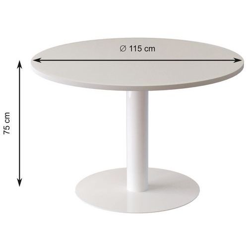 Plateau mélaminé épaisseur 25 mm bordé d'un chant épais ABS de 2 mm diamètre 115 cm Pied acier laqué époxy blanc antirayure diamêtre 120 mm Socle acier laqué époxy blanc antirayure diamètre 62 cm, épaisseur 4 mm Logistique : livré à plat