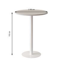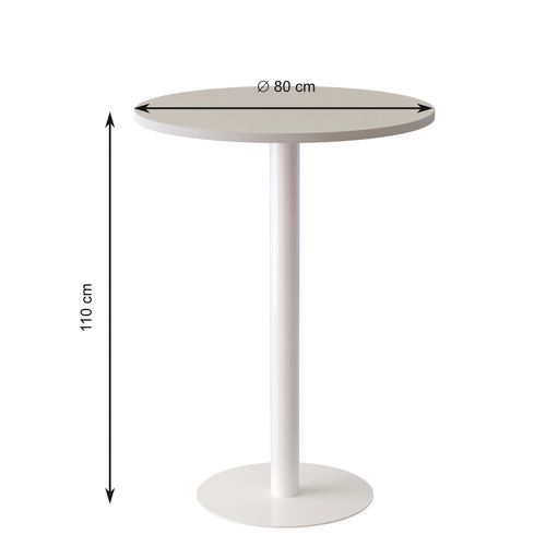 Plateau mélaminé épaisseur 25 mm avec chant ABS 2 mm Plateau hauteur 110 cm Pied acier laqué époxy blanc antirayure. Piètement central sur socle acier laqué époxy blanc anti-rayure. Socle Ø 49,5 cm, épaisseur 4 mm. Livré prêt à monter avec notice.