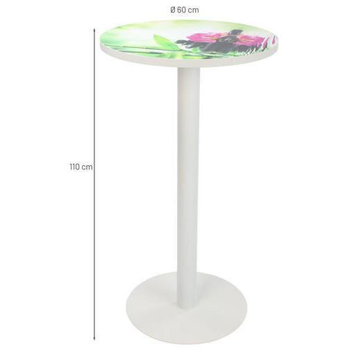 Plateau mélaminé épaisseur 25 mm avec chant ABS 2 mm Plateau hauteur 110 cm Pied acier laqué époxy blanc antirayure. Piètement central sur socle acier laqué époxy blanc anti-rayure. Socle Ø 49,5 cm, épaisseur 4 mm. Livré prêt à monter avec notice.