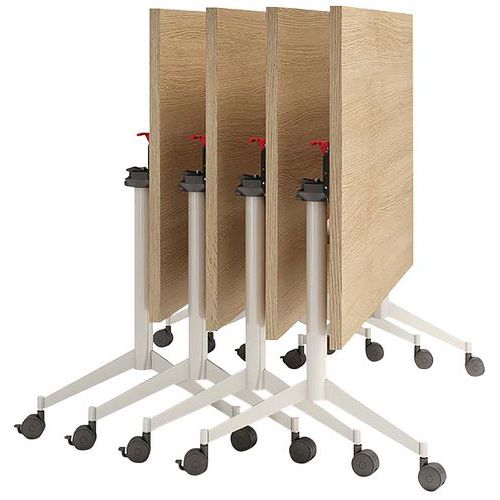 Table de réunion rectangulaire avec système de pliage simple. Rotation vers la vertical pour optimiser la place lors du rangement de votre table. Roulette facile à diriger avec frein intégré sur chaque roues. Piètement en V design et contemporain. Idéal pour vos espaces de coworking, de travail en équipe