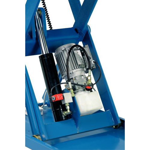 - Tables en acier, finition peinture époxy coloris bleu, montées sur vérin hydraulique.