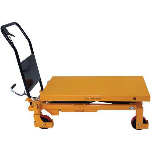 Table élévatrice à levée hydraulique avec une capacité maximale de 1000 kg. Hauteur de levée maximale de 1000 mm avec un plateau de dimension 1015x515 mm. Levée du plateau est commandée par pédale au pied, fonctionnement simple. Descente du plateau par manette située sur le timon. Préserve ses utilisateurs des troubles musculo-squelettiques. Convient pour la manutention de bac, carton ou charge lourde.