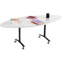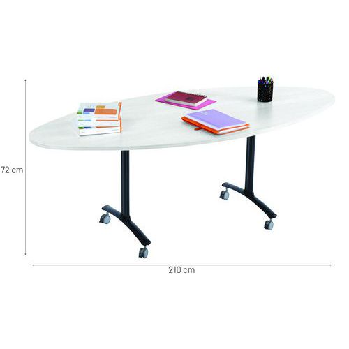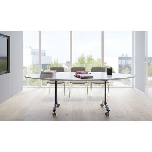 Table de réunion ovale pliante Axe avec plateau pivotant permettant un gain de place pour le rangement. Verrouillage automatique du plateau en position travail (horizontal) et position verticale (stockage) . Système de liaison rapide entre les plateaux par vis molette. Equipée de 4 roulettes Ø 75 mm avec frein.Table de réunion ovale pliante Axe avec plateau pivotant permettant un gain de place pour le rangement. Verrouillage automatique du plateau en position travail (horizontal) et position verticale (stockage) . Système de liaison rapide entre les plateaux par vis molette. Equipée de 4 roulettes Ø 75 mm avec frein. Chants ABS épaisseur 2 mm. Piètement métal laqué époxy. Fabriquée en France Livrée pieds démontés.
