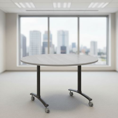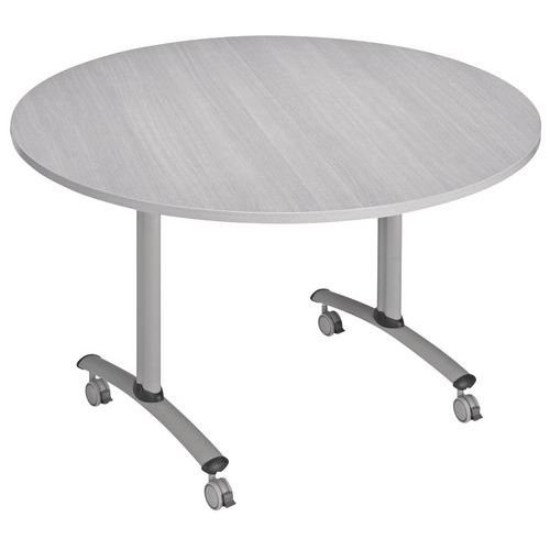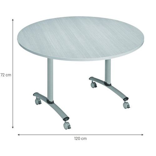 Table de réunion ronde pliante Axe avec plateau pivotant permettant un gain de place pour le rangement. Verrouillage automatique du plateau en position travail (horizontal) et position verticale (stockage) . Système de liaison rapide entre les plateaux par vis molette. Equipée de 4 roulettes Ø 75 mm avec frein.Table de réunion ronde pliante Axe avec plateau pivotant permettant un gain de place pour le rangement. Verrouillage automatique du plateau en position travail (horizontal) et position verticale (stockage) . Système de liaison rapide entre les plateaux par vis molette. Equipée de 4 roulettes Ø 75 mm avec frein. Chants ABS épaisseur 2 mm. Piètement métal laqué époxy. Fabriquée en France. Livrée pieds démontés.