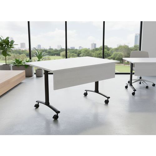 Table de réunion carrée pliante avec voile de fond Axe avec plateau pivotant permettant un gain de place pour le rangement. Plateau stratifié permettant des repas et le nettoyage à l’eau savonneuse. Verrouillage automatique du plateau en position travail (horizontal) et position verticale (stockage) . Système de liaison rapide entre les plateaux par vis molette. Equipée de 4 roulettes Ø 75 mm avec frein. Voile de fond hauteur 25 cm. Chants ABS épaisseur 2 mm. Piètement métal laqué époxy. Fabriquée en France Livrée pieds démontés.