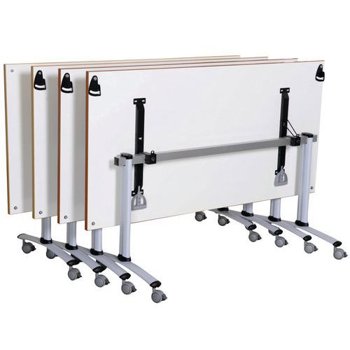 Table de réunion rectangulaire pliante Axe avec plateau stratifié pivotant permettant un gain de place pour le rangement. Verrouillage automatique du plateau en position travail (horizontal) et position verticale (stockage) . Système de liaison rapide entre les plateaux par vis molette. Equipée de 4 roulettes Ø 75 mm avec frein.Table de réunion rectangulaire pliante Axe avec plateau pivotant permettant un gain de place pour le rangement. Verrouillage automatique du plateau en position travail (horizontal) et position verticale (stockage) . Système de liaison rapide entre les plateaux par vis molette. Equipée de 4 roulettes Ø 75 mm avec frein. Chants ABS épaisseur 2 mm. Piètement métal laqué époxy. Fabriquée en France. Livrée pieds démontés.