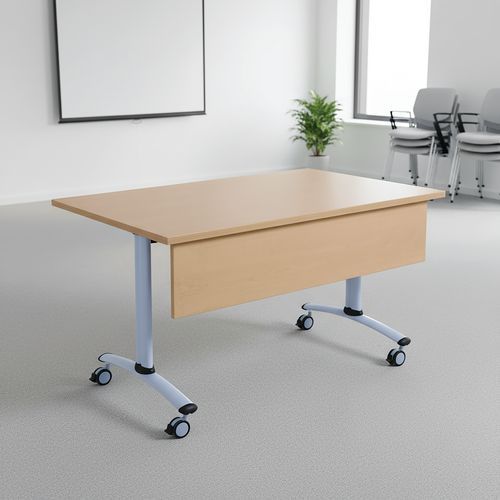 Table de réunion rectangulaire pliante avec voile de fond Axe avec plateau pivotant permettant un gain de place pour le rangement. Plateau stratifié permettant des repas et le nettoyage à l’eau savonneuse Verrouillage automatique du plateau en position travail (horizontal) et position verticale (stockage) . Système de liaison rapide entre les plateaux par vis molette. Equipée de 4 roulettes Ø 75 mm avec frein. Voile de fond hauteur 25 cm. Chants ABS épaisseur 2 mm. Piètement métal laqué époxy. Fabriquée en France. Livrée pieds démontés.