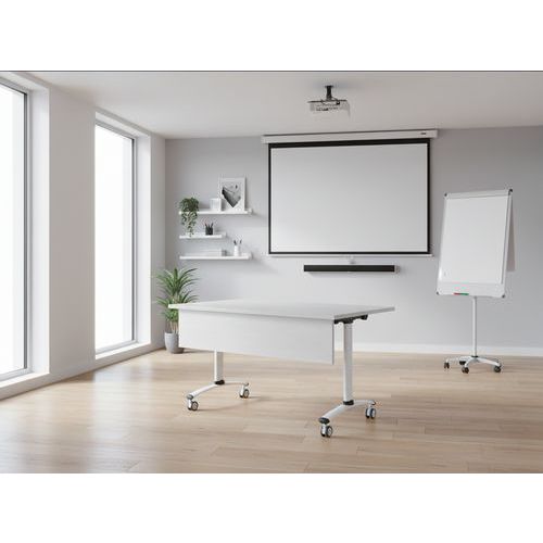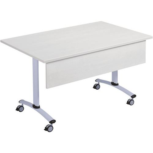 Table de réunion rectangulaire pliante avec voile de fond Axe avec plateau pivotant permettant un gain de place pour le rangement. Plateau stratifié permettant des repas et le nettoyage à l’eau savonneuse Verrouillage automatique du plateau en position travail (horizontal) et position verticale (stockage) . Système de liaison rapide entre les plateaux par vis molette. Equipée de 4 roulettes Ø 75 mm avec frein. Voile de fond hauteur 25 cm. Chants ABS épaisseur 2 mm. Piètement métal laqué époxy. Fabriquée en France. Livrée pieds démontés.