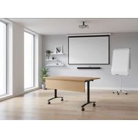Table de réunion rectangulaire pliante avec voile de fond Axe avec plateau pivotant permettant un gain de place pour le rangement.  Verrouillage automatique du plateau en position travail (horizontal) et position verticale (stockage) .  Système de liaison rapide entre les plateaux par vis molette.  Equipée de 4 roulettes Ø 75 mm avec frein.Table de réunion rectangulaire pliante avec voile de fond Axe avec plateau pivotant permettant un gain de place pour le rangement.  Verrouillage automatique du plateau en position travail (horizontal) et position verticale (stockage) .  Système de liaison rapide entre les plateaux par vis molette.  Equipée de 4 roulettes Ø 75 mm avec frein.   Voile de fond hauteur 25 cm.  Chants ABS épaisseur 2 mm.   Piètement métal laqué époxy.   Fabriquée en France.  Livrée pieds démontés.