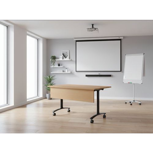 Table de réunion rectangulaire pliante avec voile de fond Axe avec plateau pivotant permettant un gain de place pour le rangement. Verrouillage automatique du plateau en position travail (horizontal) et position verticale (stockage) . Système de liaison rapide entre les plateaux par vis molette. Equipée de 4 roulettes Ø 75 mm avec frein.Table de réunion rectangulaire pliante avec voile de fond Axe avec plateau pivotant permettant un gain de place pour le rangement. Verrouillage automatique du plateau en position travail (horizontal) et position verticale (stockage) . Système de liaison rapide entre les plateaux par vis molette. Equipée de 4 roulettes Ø 75 mm avec frein. Voile de fond hauteur 25 cm. Chants ABS épaisseur 2 mm. Piètement métal laqué époxy. Fabriquée en France. Livrée pieds démontés.