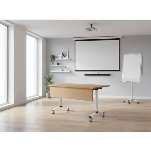 Table de réunion rectangulaire pliante avec voile de fond Axe avec plateau pivotant permettant un gain de place pour le rangement. Verrouillage automatique du plateau en position travail (horizontal) et position verticale (stockage) . Système de liaison rapide entre les plateaux par vis molette. Equipée de 4 roulettes Ø 75 mm avec frein.Table de réunion rectangulaire pliante avec voile de fond Axe avec plateau pivotant permettant un gain de place pour le rangement. Verrouillage automatique du plateau en position travail (horizontal) et position verticale (stockage) . Système de liaison rapide entre les plateaux par vis molette. Equipée de 4 roulettes Ø 75 mm avec frein. Voile de fond hauteur 25 cm. Chants ABS épaisseur 2 mm. Piètement métal laqué époxy. Fabriquée en France. Livrée pieds démontés.