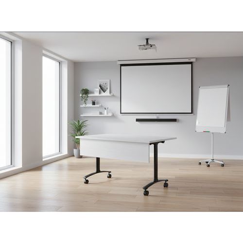 Table de réunion rectangulaire pliante avec voile de fond Axe avec plateau pivotant permettant un gain de place pour le rangement. Plateau stratifié permettant des repas et le nettoyage à l’eau savonneuse Verrouillage automatique du plateau en position travail (horizontal) et position verticale (stockage) . Système de liaison rapide entre les plateaux par vis molette. Equipée de 4 roulettes Ø 75 mm avec frein. Voile de fond hauteur 25 cm. Chants ABS épaisseur 2 mm. Piètement métal laqué époxy. Fabriquée en France. Livrée pieds démontés.