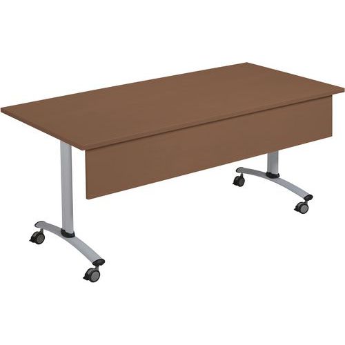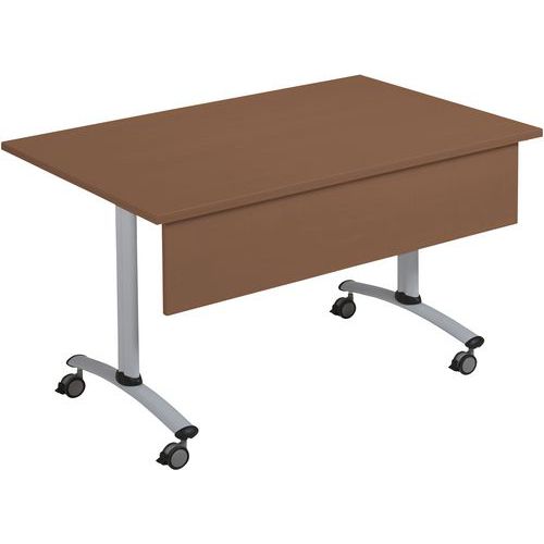 Table de réunion rectangulaire avec voile de fond Axe avec plateau pivotant permettant un gain de place pour le rangement. Verrouillage automatique du plateau en position travail (horizontal) et position verticale (stockage) . Système de liaison rapide entre les plateaux par vismolettes. Equipée de 4 roulettes en polyamide Ø 75 mm avec frein.Table de réunion rectangulaire avec voile de fond Axe avec plateau pivotant permettant un gain de place pour le rangement. Verrouillage automatique du plateau en position travail (horizontal) et position verticale (stockage) . Système de liaison rapide entre les plateaux par vismolettes. Equipée de 4 roulettes en polyamide Ø 75 mm avec frein. Voile de fond hauteur 25 cm. Chants ABS épaisseur 3 mm. Piètement métal laqué époxy. Fabriquée en France Livrée pieds démontés.