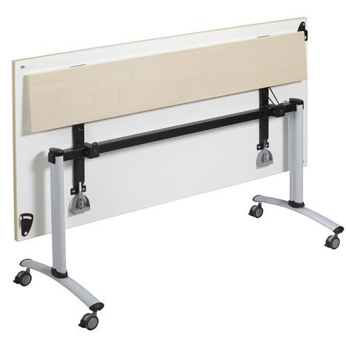 Table de réunion rectangulaire avec voile de fond Axe avec plateau pivotant permettant un gain de place pour le rangement. Verrouillage automatique du plateau en position travail (horizontal) et position verticale (stockage) . Système de liaison rapide entre les plateaux par vismolettes. Equipée de 4 roulettes en polyamide Ø 75 mm avec frein.Table de réunion rectangulaire avec voile de fond Axe avec plateau pivotant permettant un gain de place pour le rangement. Verrouillage automatique du plateau en position travail (horizontal) et position verticale (stockage) . Système de liaison rapide entre les plateaux par vismolettes. Equipée de 4 roulettes en polyamide Ø 75 mm avec frein. Voile de fond hauteur 25 cm. Chants ABS épaisseur 3 mm. Piètement métal laqué époxy. Fabriquée en France Livrée pieds démontés.