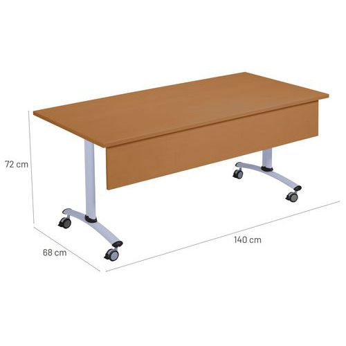 Table de réunion rectangulaire avec voile de fond Axe avec plateau pivotant permettant un gain de place pour le rangement. Verrouillage automatique du plateau en position travail (horizontal) et position verticale (stockage) . Système de liaison rapide entre les plateaux par vismolettes. Equipée de 4 roulettes en polyamide Ø 75 mm avec frein.Table de réunion rectangulaire avec voile de fond Axe avec plateau pivotant permettant un gain de place pour le rangement. Verrouillage automatique du plateau en position travail (horizontal) et position verticale (stockage) . Système de liaison rapide entre les plateaux par vismolettes. Equipée de 4 roulettes en polyamide Ø 75 mm avec frein. Voile de fond hauteur 25 cm. Chants ABS épaisseur 3 mm. Piètement métal laqué époxy. Fabriquée en France Livrée pieds démontés.
