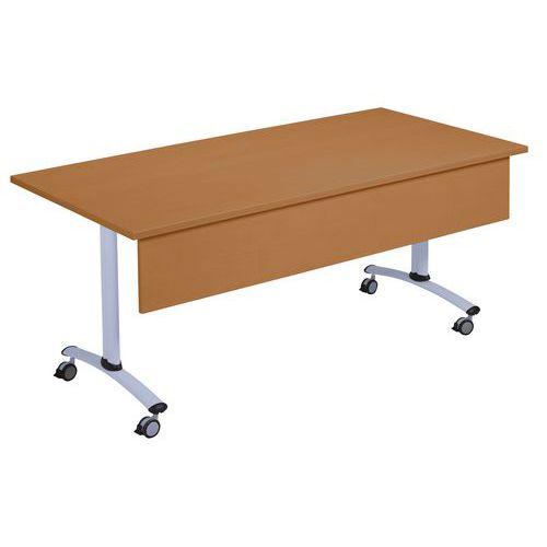 Table de réunion rectangulaire avec voile de fond Axe avec plateau pivotant permettant un gain de place pour le rangement. Verrouillage automatique du plateau en position travail (horizontal) et position verticale (stockage) . Système de liaison rapide entre les plateaux par vismolettes. Equipée de 4 roulettes en polyamide Ø 75 mm avec frein.Table de réunion rectangulaire avec voile de fond Axe avec plateau pivotant permettant un gain de place pour le rangement. Verrouillage automatique du plateau en position travail (horizontal) et position verticale (stockage) . Système de liaison rapide entre les plateaux par vismolettes. Equipée de 4 roulettes en polyamide Ø 75 mm avec frein. Voile de fond hauteur 25 cm. Chants ABS épaisseur 3 mm. Piètement métal laqué époxy. Fabriquée en France Livrée pieds démontés.