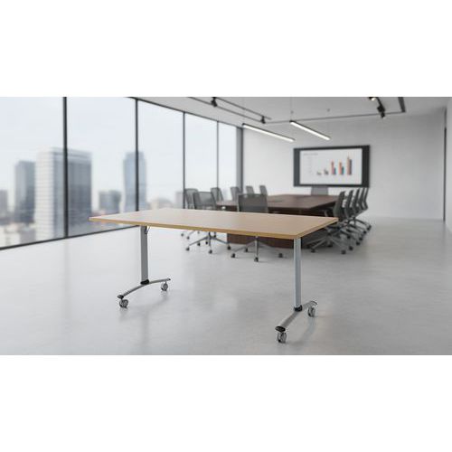 Table de réunion rectangulaire Axe avec plateau pivotant permettant un gain de place pour le rangement. Verrouillage automatique du plateau en position travail (horizontal) et position verticale (stockage) . Système de liaison rapide entre les plateaux par vismolettes. Equipée de 4 roulettes en polyamide Ø 75 mm avec frein.Table de réunion rectangulaire Axe avec plateau pivotant permettant un gain de place pour le rangement. Verrouillage automatique du plateau en position travail (horizontal) et position verticale (stockage) . Système de liaison rapide entre les plateaux par vismolettes. Equipée de 4 roulettes en polyamide Ø 75 mm avec frein. Chants ABS épaisseur 3 mm. Piètement métal laqué époxy. Fabriqué en France Livrée pieds démontés.