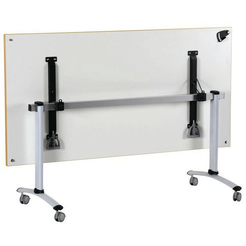 Table de réunion rectangulaire Axe avec plateau pivotant permettant un gain de place pour le rangement. Verrouillage automatique du plateau en position travail (horizontal) et position verticale (stockage) . Système de liaison rapide entre les plateaux par vismolettes. Equipée de 4 roulettes en polyamide Ø 75 mm avec frein.Table de réunion rectangulaire Axe avec plateau pivotant permettant un gain de place pour le rangement. Verrouillage automatique du plateau en position travail (horizontal) et position verticale (stockage) . Système de liaison rapide entre les plateaux par vismolettes. Equipée de 4 roulettes en polyamide Ø 75 mm avec frein. Chants ABS épaisseur 3 mm. Piètement métal laqué époxy. Fabriqué en France Livrée pieds démontés.