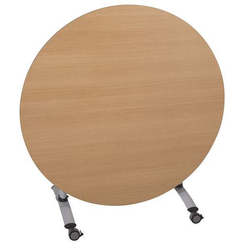 Table de réunion ronde Axe avec plateau pivotant permettant un gain de place pour le rangement. Verrouillage automatique du plateau en position travail (horizontal) et position verticale (stockage). Système de liaison rapide entre les plateaux par vis molettes. Equipée de 4 roulettes en polyamide Ø 75 mm avec frein.Table de réunion ronde Axe avec plateau pivotant permettant un gain de place pour le rangement. Verrouillage automatique du plateau en position travail (horizontal) et position verticale (stockage). Système de liaison rapide entre les plateaux par vis molettes. Equipée de 4 roulettes en polyamide Ø 75 mm avec frein. Chants ABS épaisseur 3 mm. Piètement métal laqué époxy. Fabriqué en France Livrée pieds démontés.